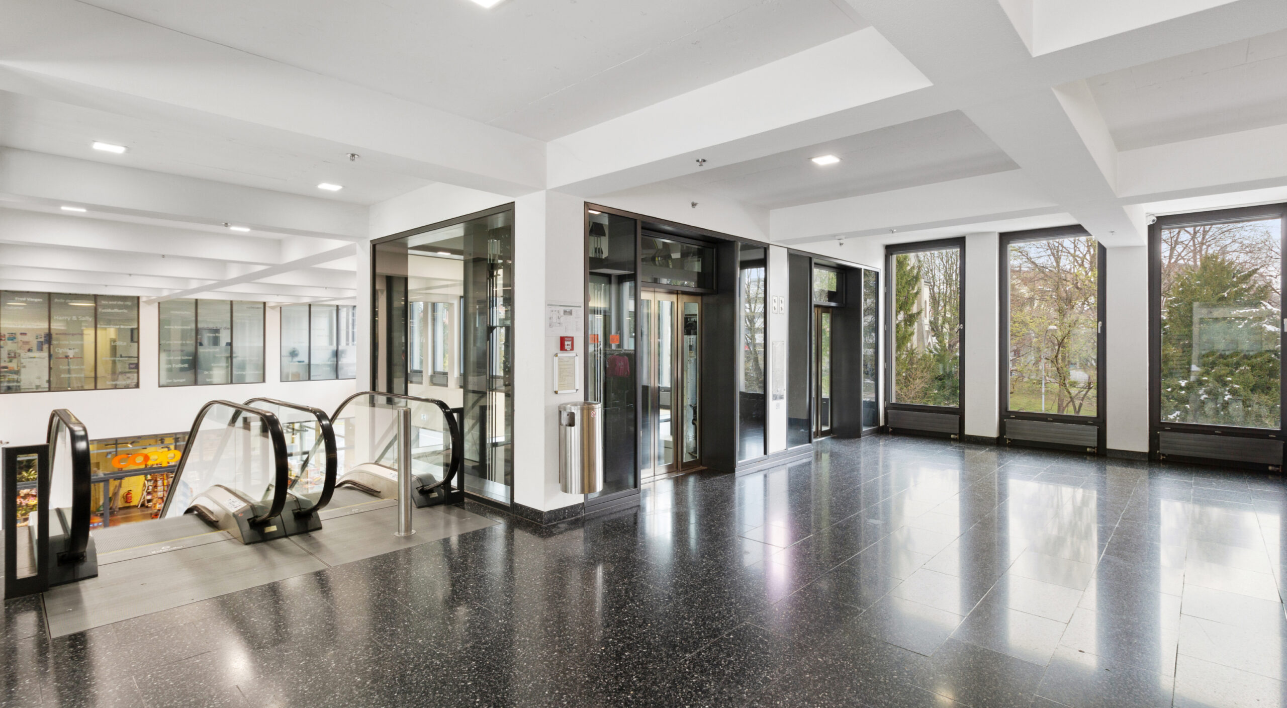 Mit den zentral angeordneten Rolltreppen und Aufzugsanlagen sowie der leichten Geländerkonstruktion der Galerie bzw. des Obergeschosses, sind die funktional entscheidenden Aspekte der Erschliessung wie auch der Transparenz aufgenommen und in das Projekt integriert worden.